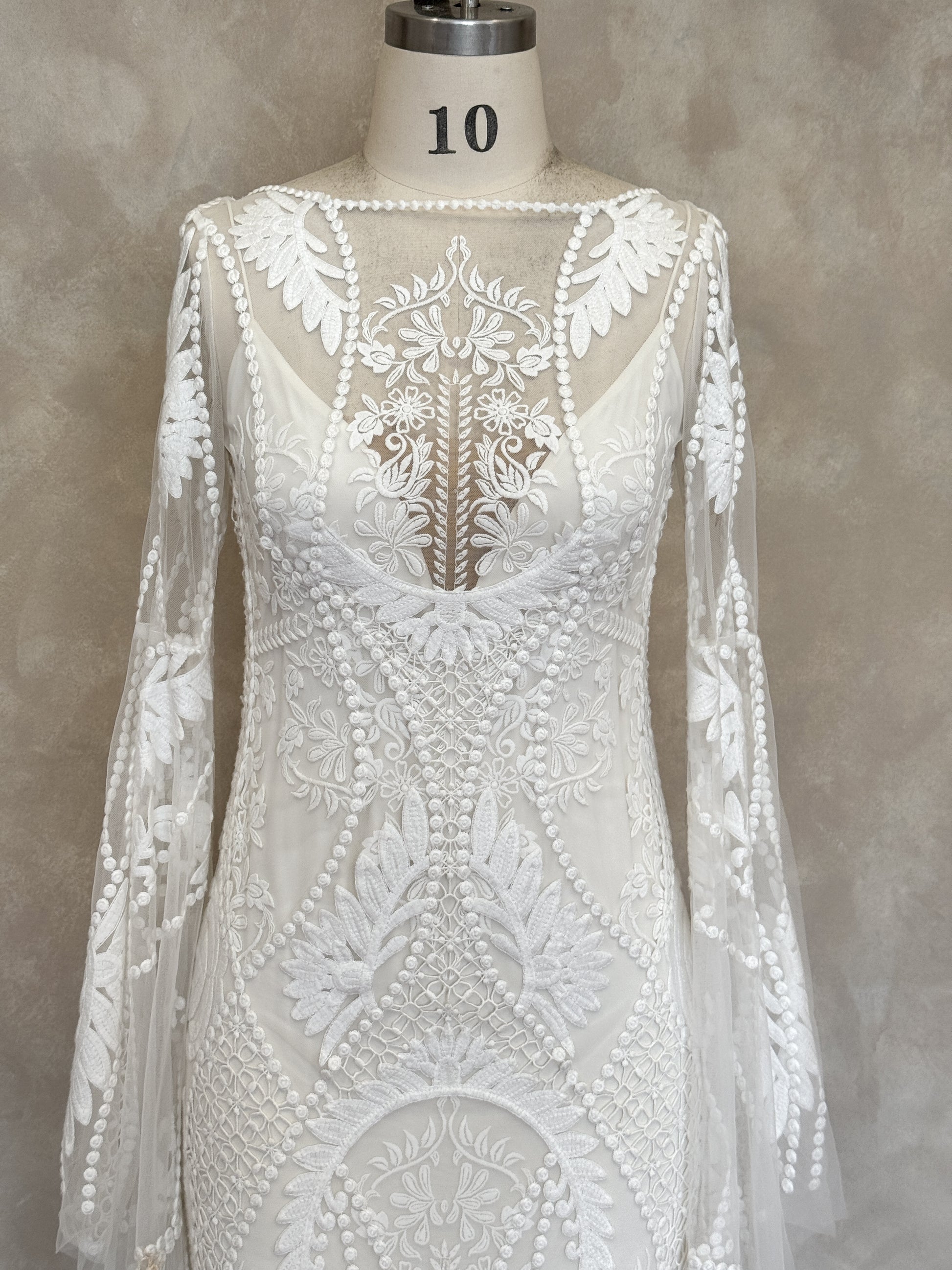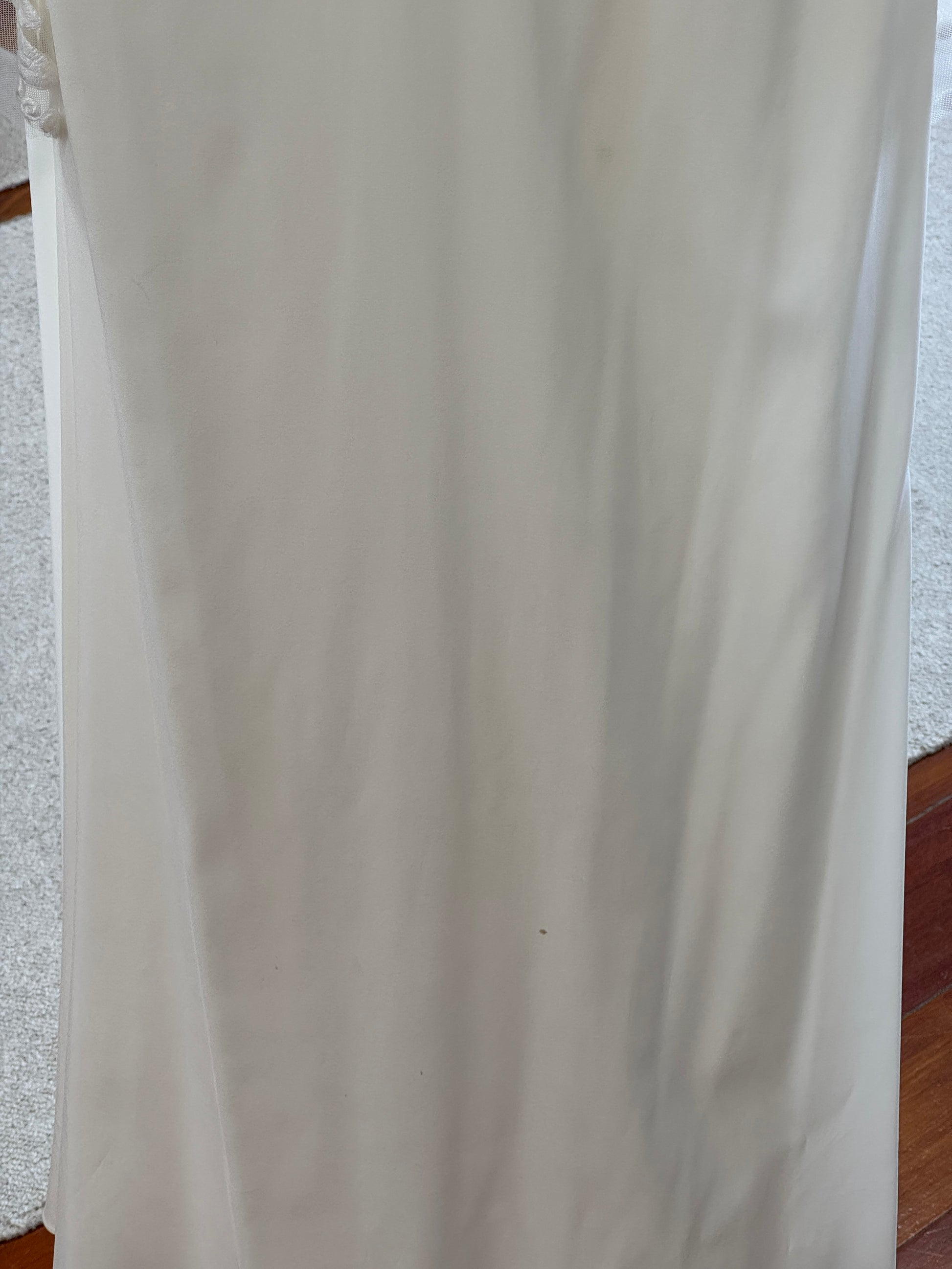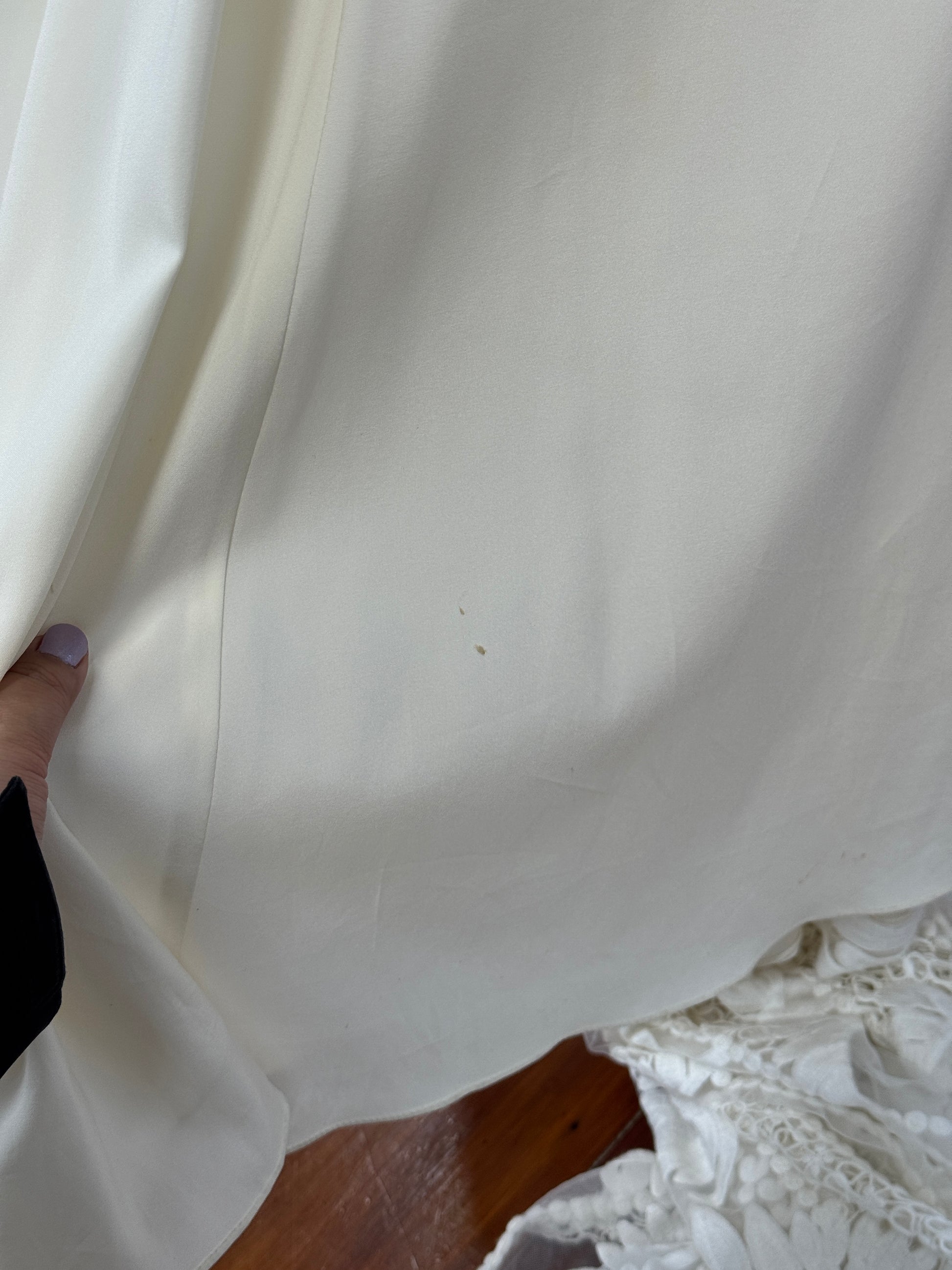 • This sample is being kept in a secure, climate controlled storage. This sample features the following noticeable wear: marks on lace - right sleeve (~15 cm up from inner sleeve hem), makeup marks on inner neckline, marks on inner lining. Photos of the flaws can be found in this listing, and pricing of this sample is reflective of this wear. Additional imperfections may be present on this gown, but are considered *minor.