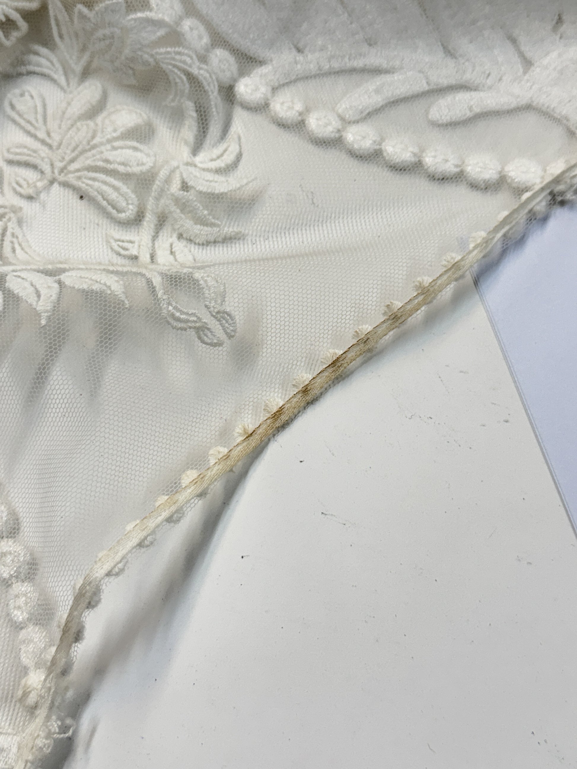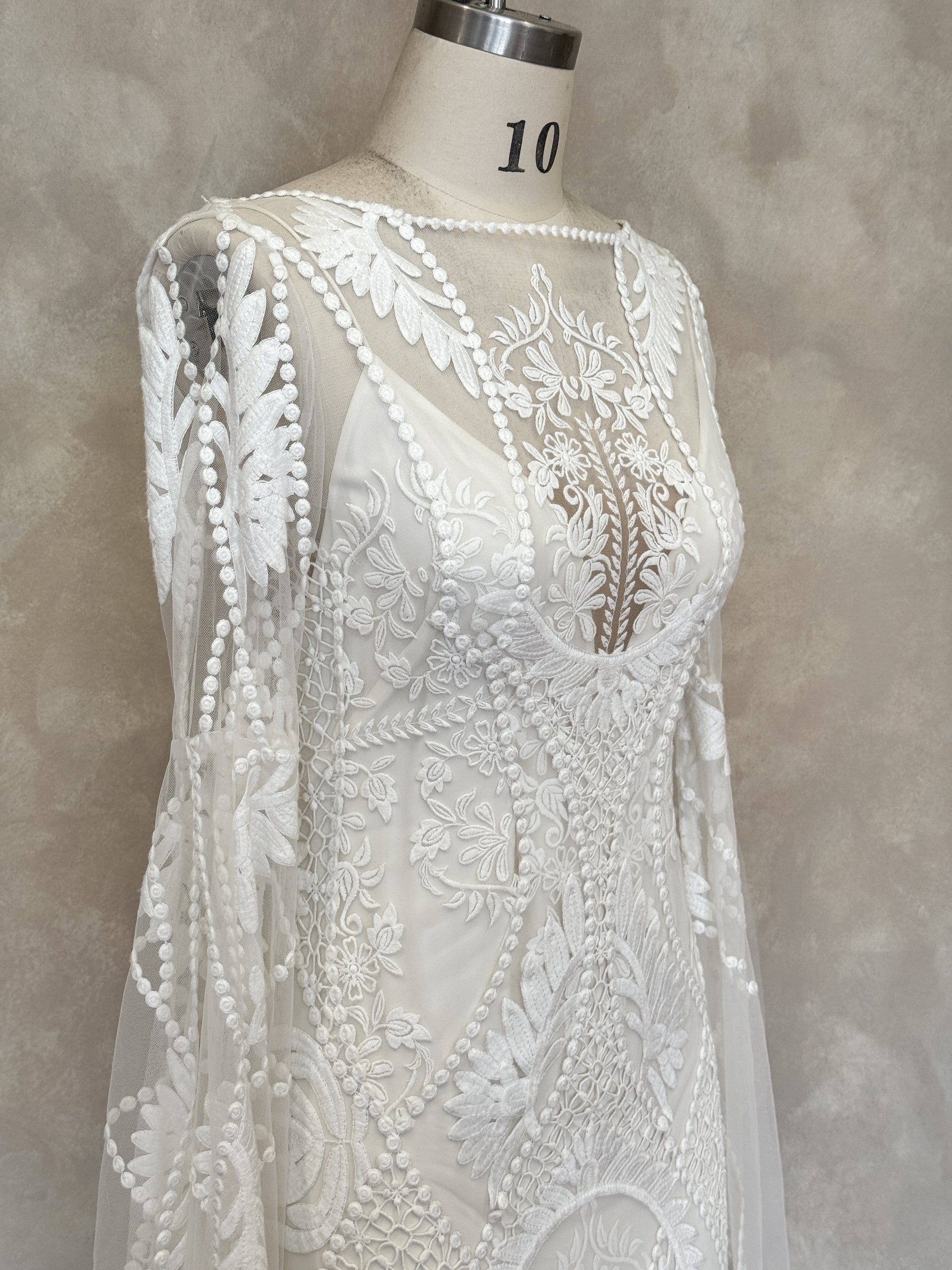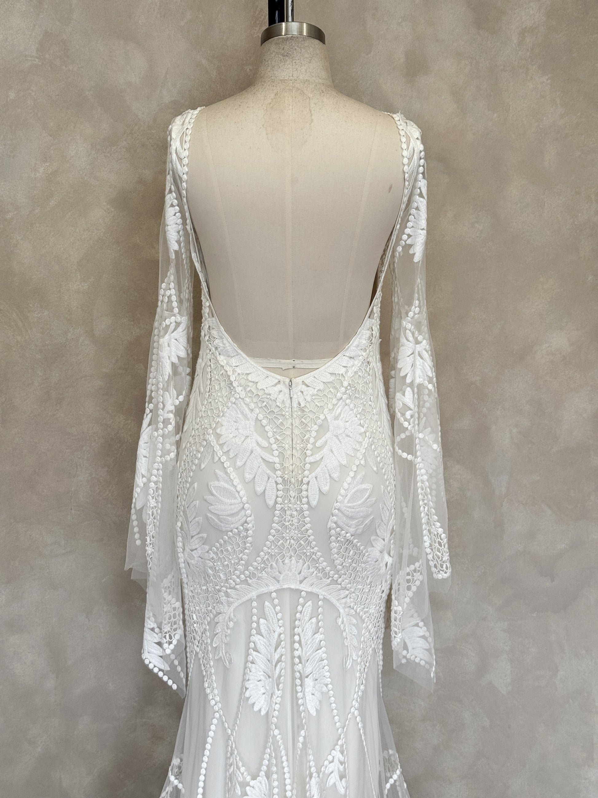 • This sample is being kept in a secure, climate controlled storage. This sample features the following noticeable wear: marks on lace - right sleeve (~15 cm up from inner sleeve hem), makeup marks on inner neckline, marks on inner lining. Photos of the flaws can be found in this listing, and pricing of this sample is reflective of this wear. Additional imperfections may be present on this gown, but are considered *minor.