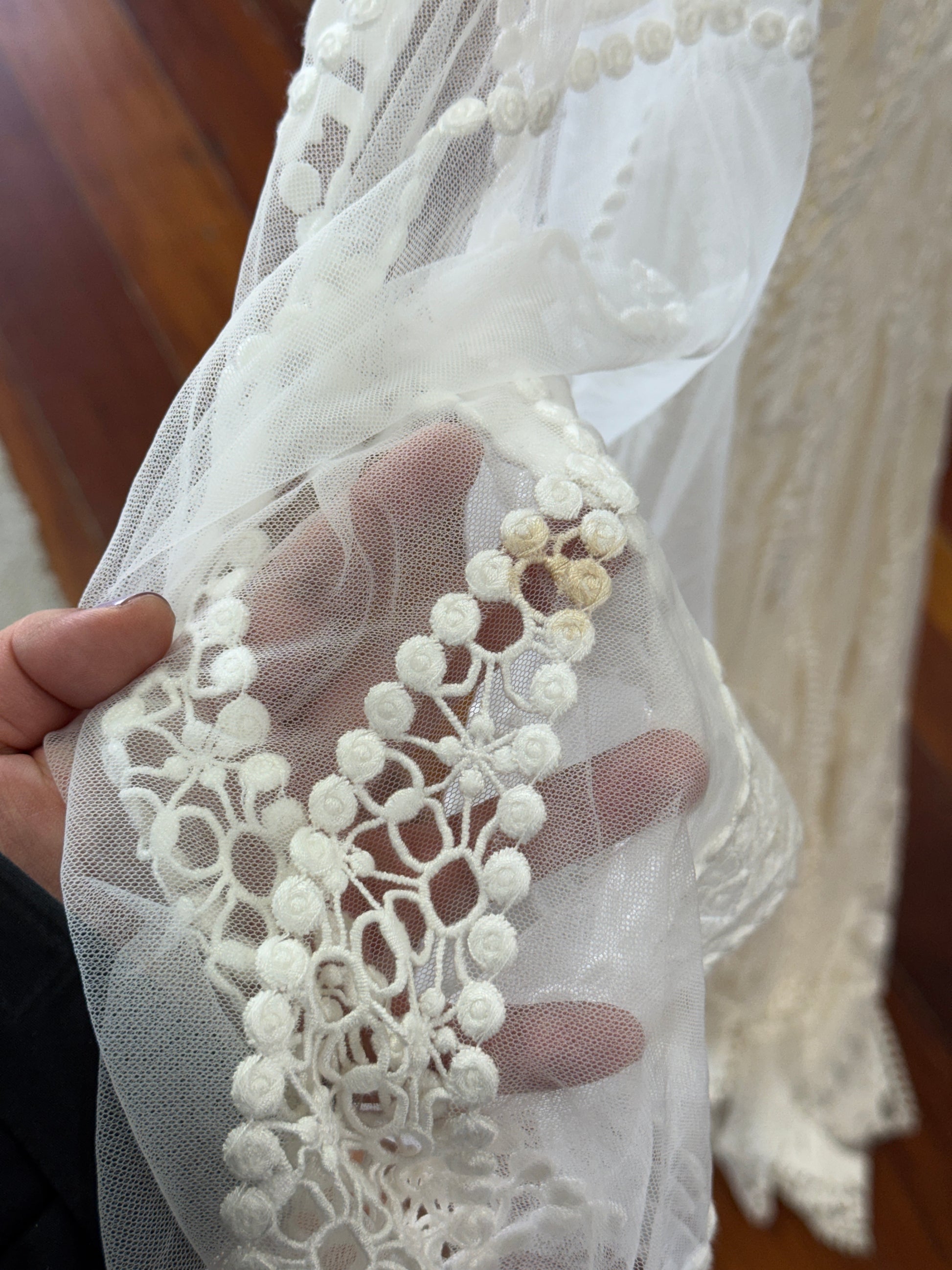 Please expect that there may be some very minor imperfections to your sample gown; these may include slight pulling of threads on the outer or lining, slight difference in colour to the original, light marks or stains, or the size may not be 100% true to original (due to the gown being tried on).