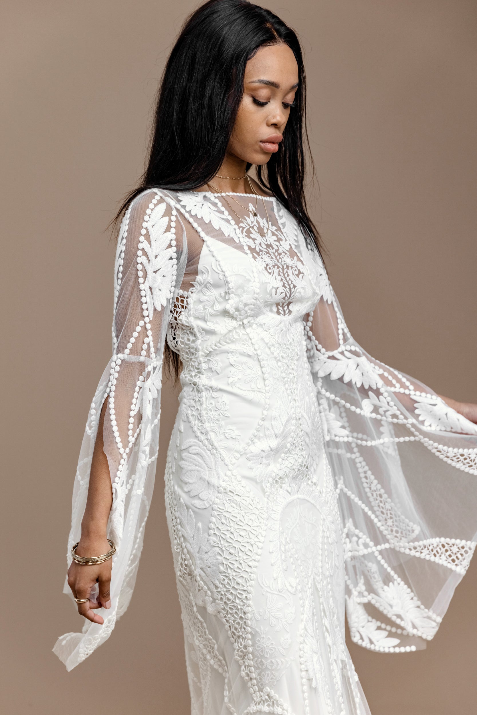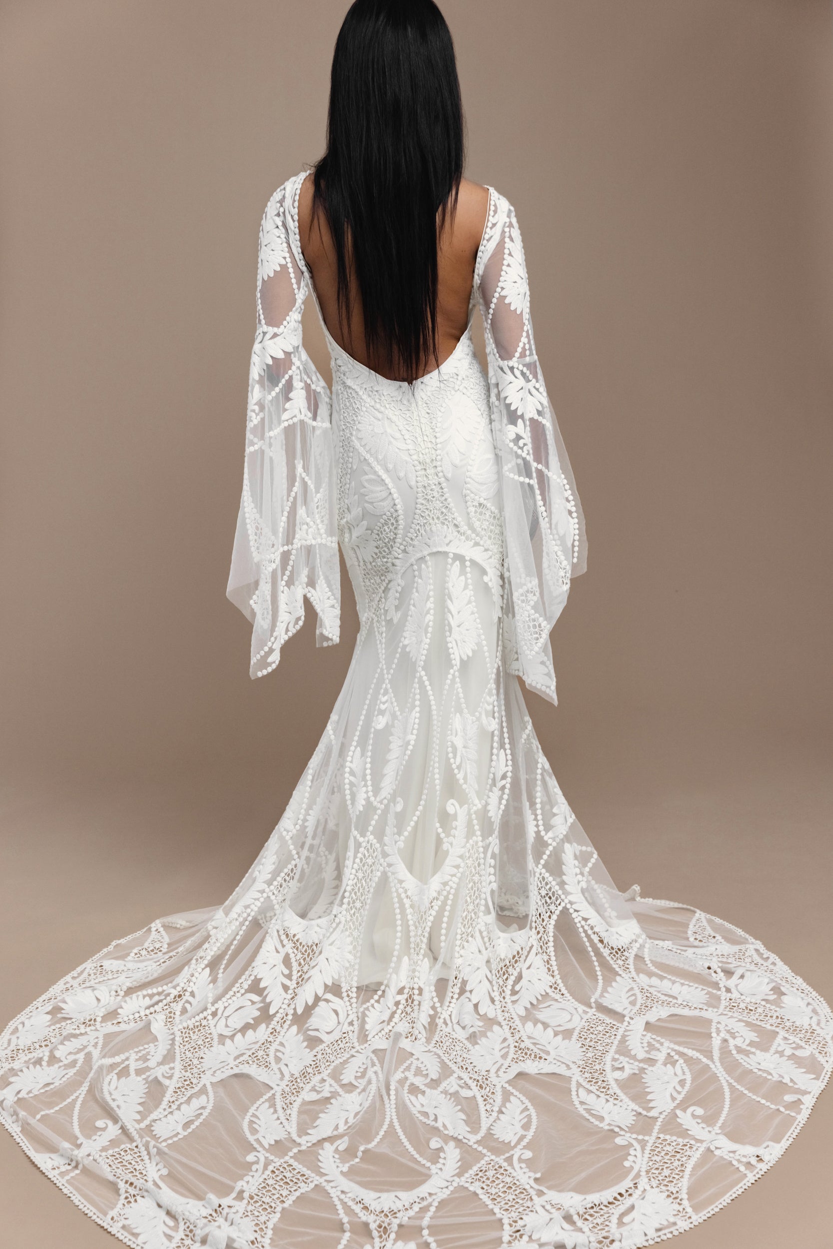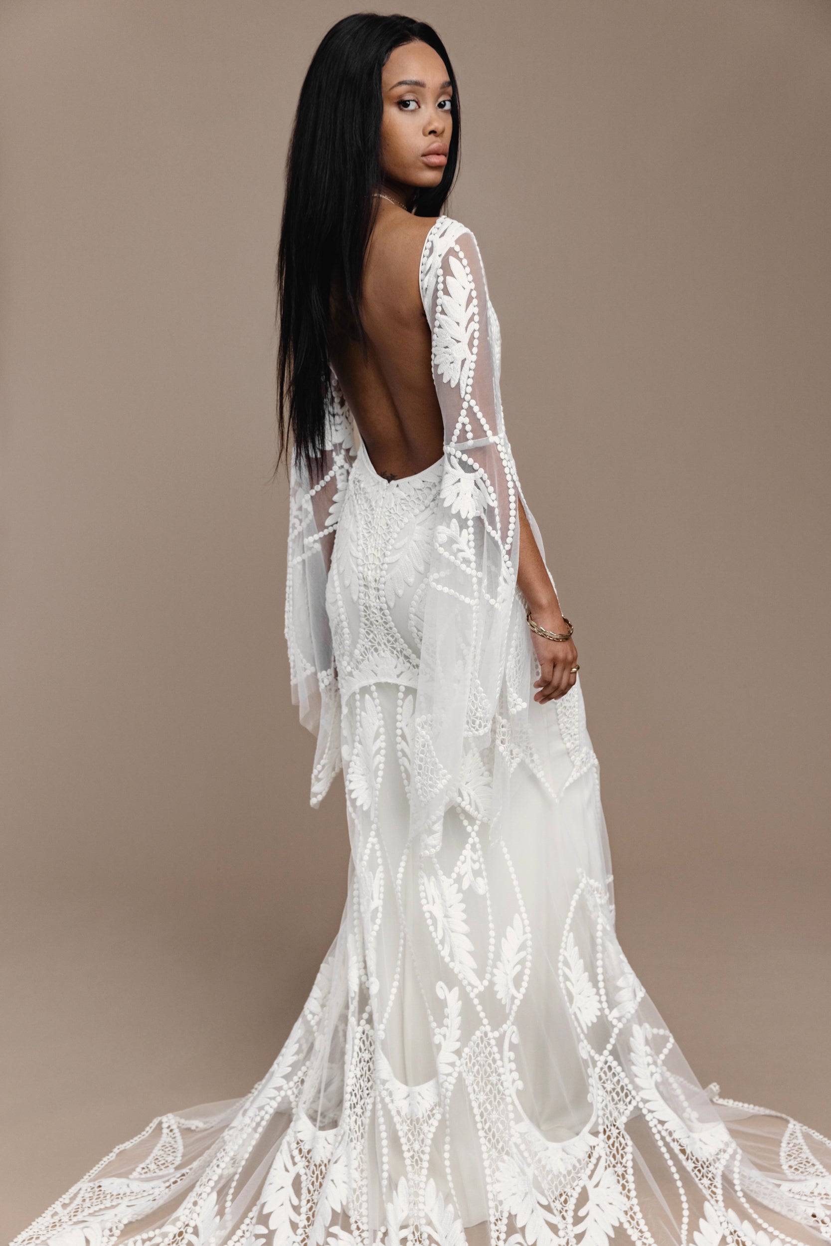 Embrace your inner goddess. Gaia’s cotton and rayon openwork lace uses delicate embroidered flowers and organic lines for softness and romance. Gaia swirls gracefully around the body: from a subtle cutaway neckline, to a sweeping open back, sensuous curves and a lush lace train. A soft, front-split sleeve sparks magic and movement.