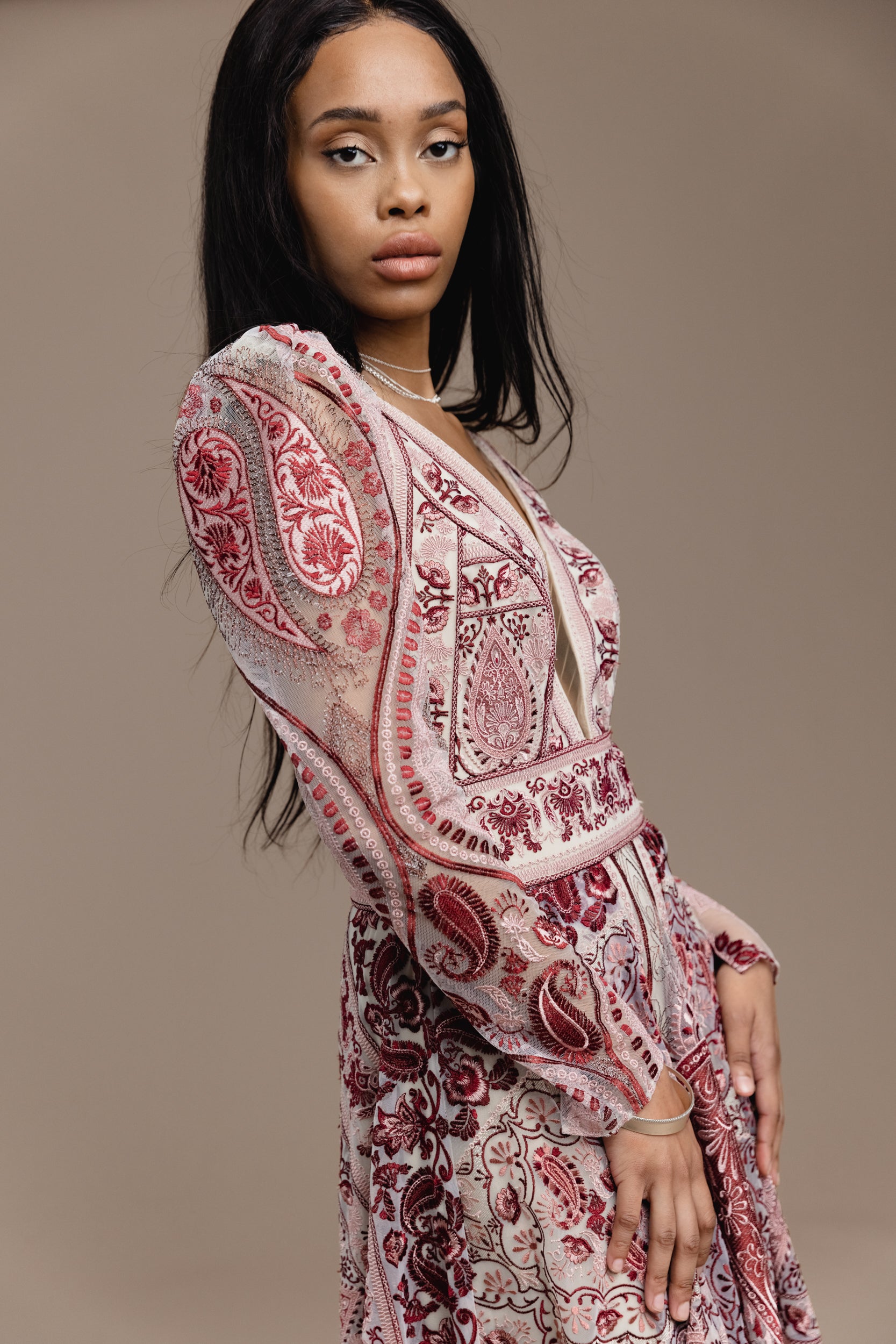 Take the plunge in Kyara. A structured, silk-lined bodice and deep V neckline contrast the playful spirit of a flowing A-line skirt. Adorned with delicate folk-art lace and band work, Kyara's detailed full skirt makes this dreamy gown utterly feminine at every angle. Add the matching Nova Sleeves for an effortless transition from ceremony to reception.
