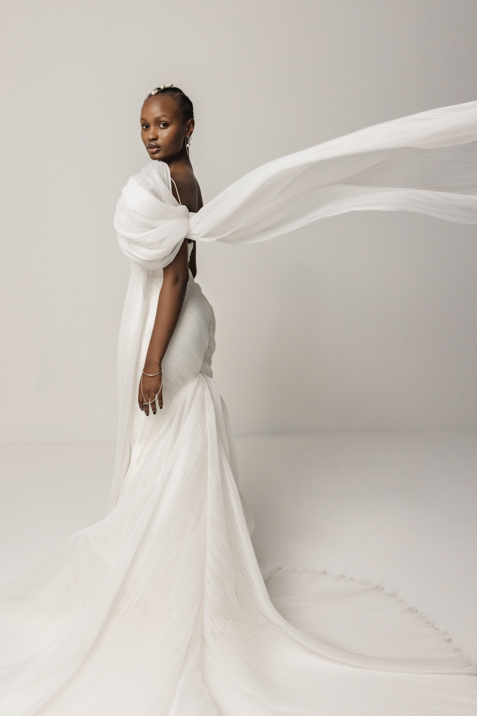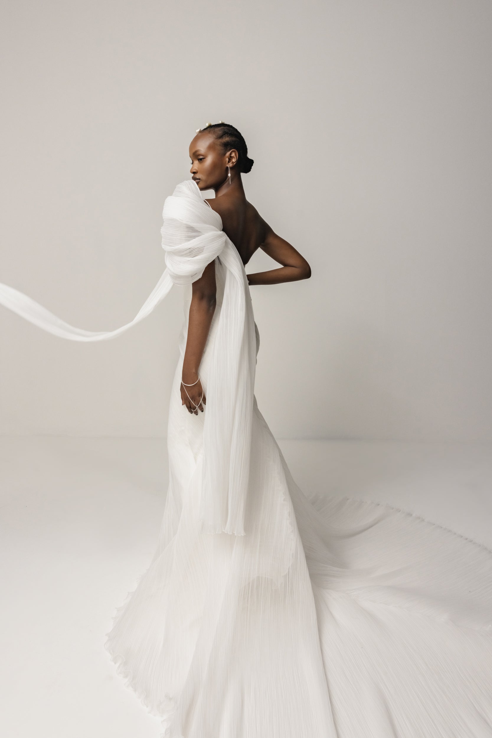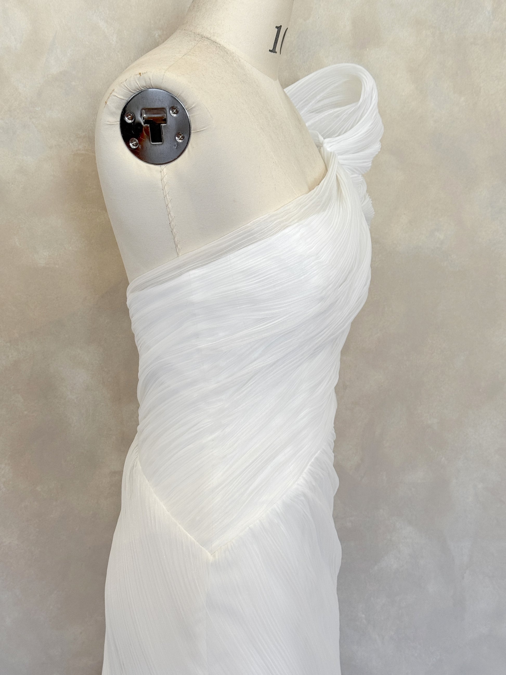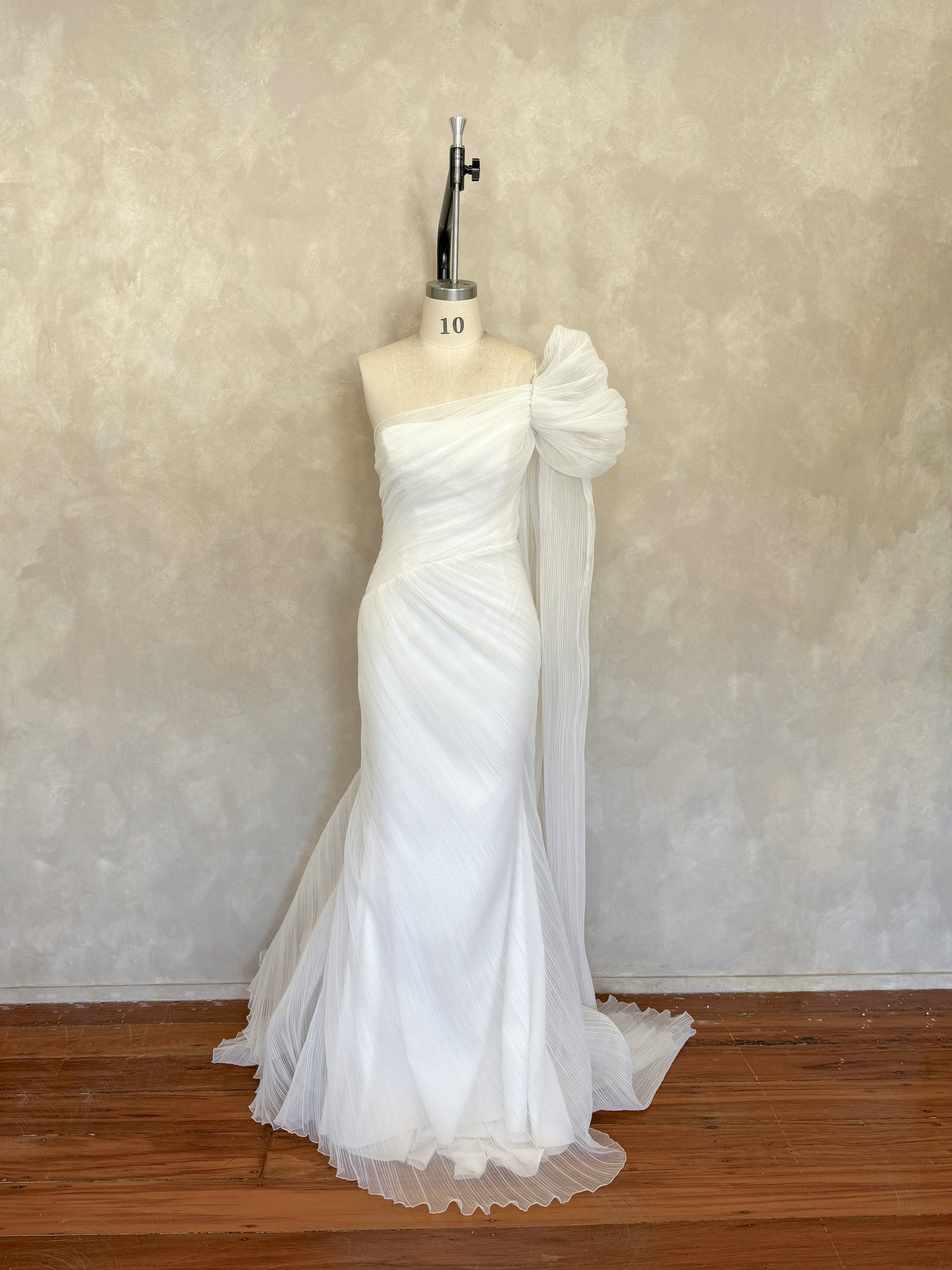 Where sculpture meets drape - Thea is a timeless classic with a fully structured bodice and hand-crafted angled neckline in pleated organza, creating a beautiful asymmetry that accentuates the waist and curves of the body. A wrap-around armband drapes off the shoulder with whisps of tulle cascading from it to create a statement. Add the asymmetrical Thea Sleeve for added drama and volume.